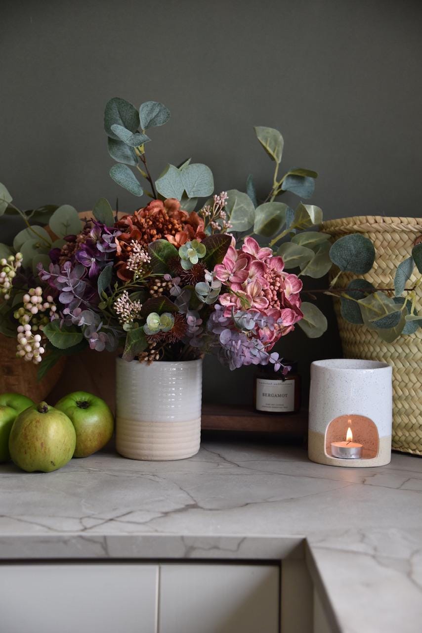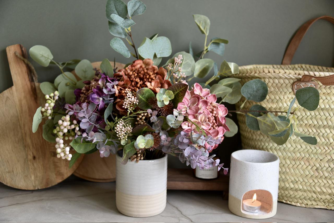 Our Harvest bloom bouquet boasts dried purple, orange and soft pink hydrangeas, with delicate pink berries, burnt orange thistles and realistic eucalyptus leaves.