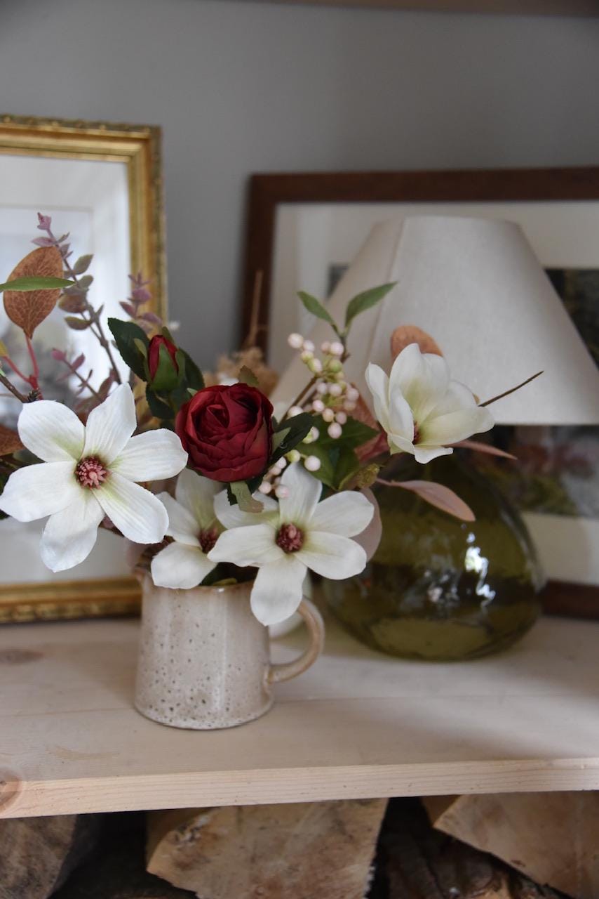 This faux flower arrangement is timeless and made to fit into any home, whether it be a farmhouse, modern decor or simplistic.