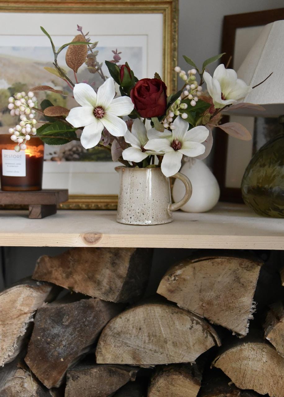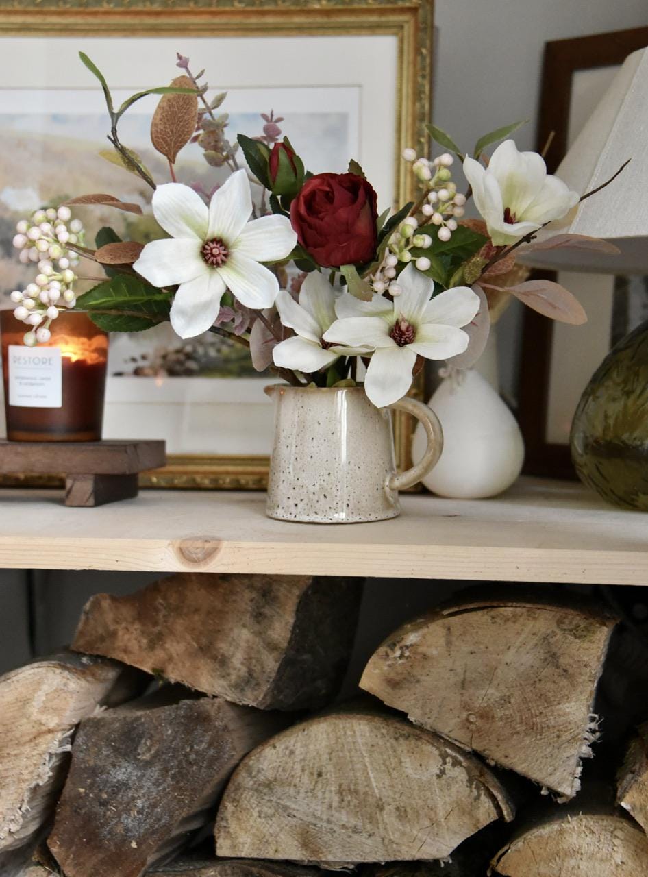 • Faux autumn flower arrangement (long lasting botanicals)• Includes: cream magnolias, red rose, pink berries, frosted eucalyptus