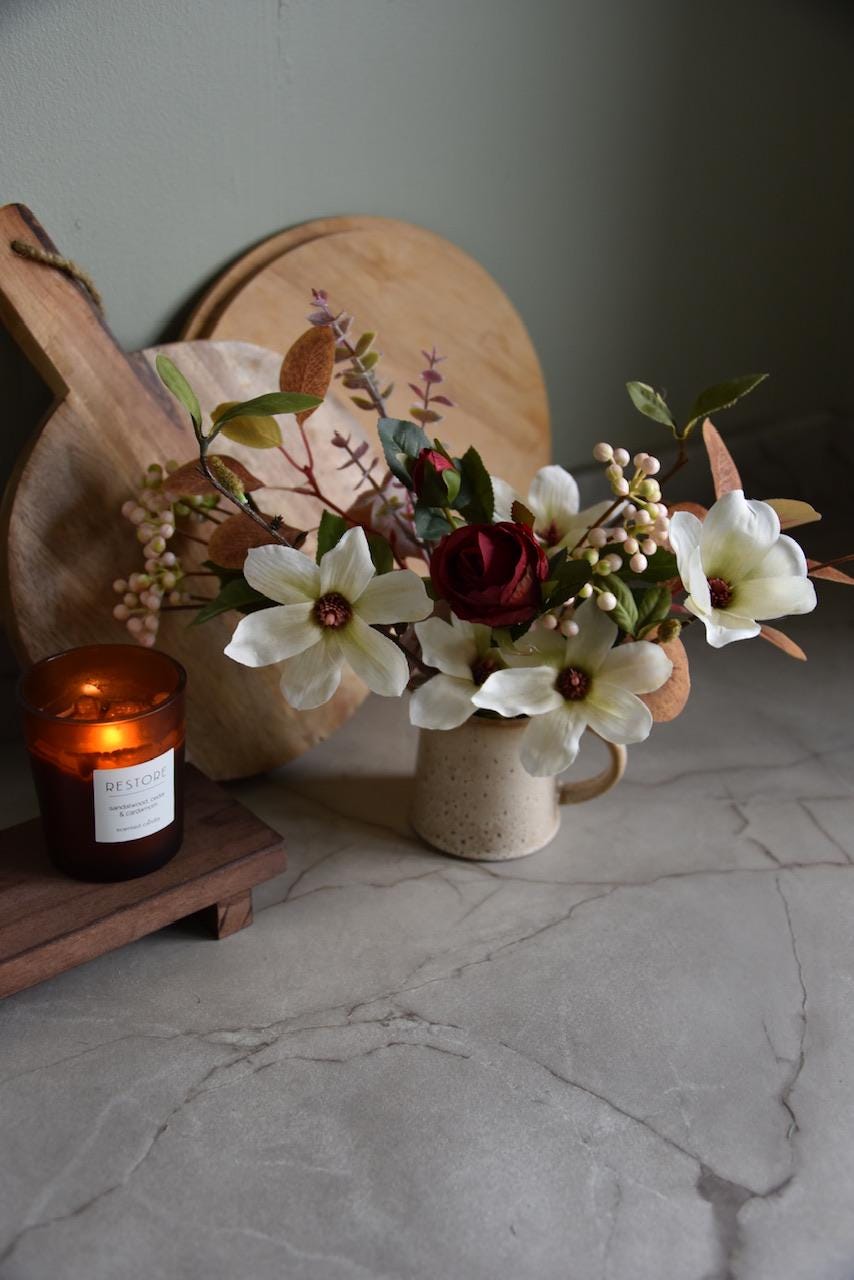 Bring a touch of seasonal charm to your home with this petite autumn-inspired arrangement. Featuring elegant cream magnolias, a rich red rose, delicate pink berries, orange gum nut berries and frosted eucalyptus sprigs, this arrangement combines warmth and elegance in a timeless design. Can come as flower arrangement only or with the rustic handmade jug pictured.