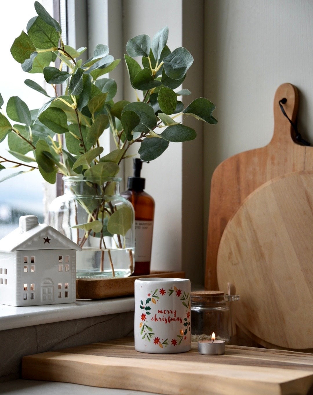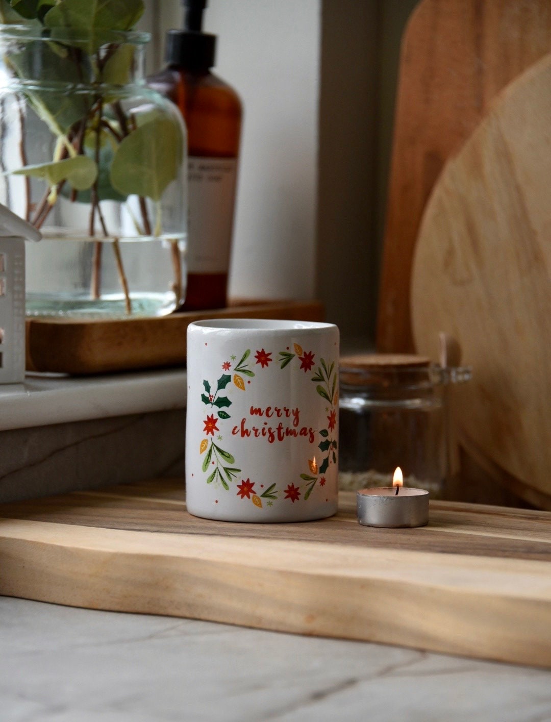 It has ‘Merry Christmas’ illustrated on the front and a floral Christmas Wreath around the writing.