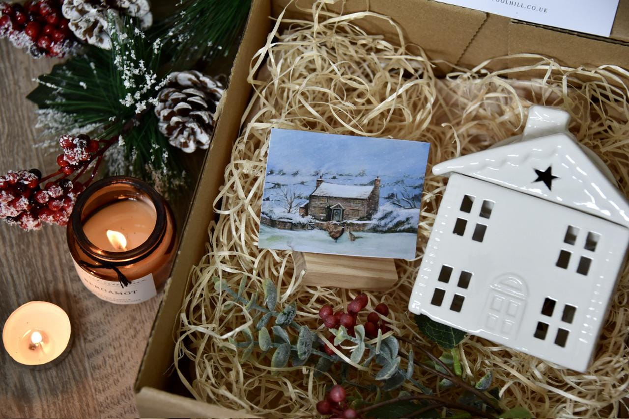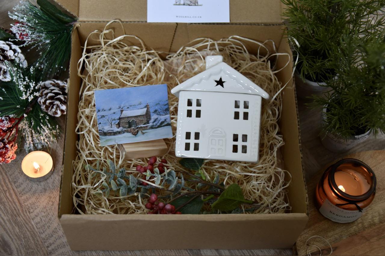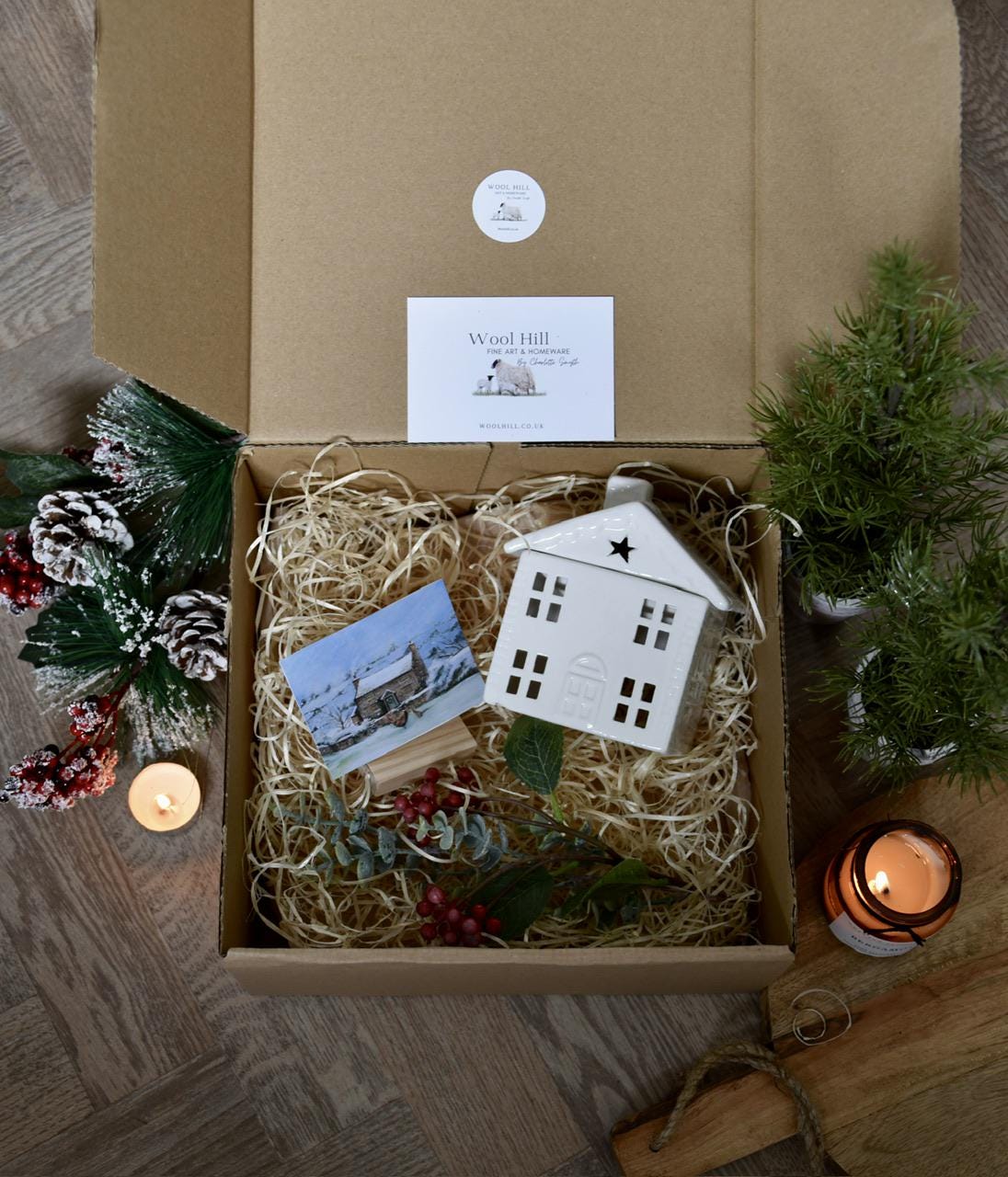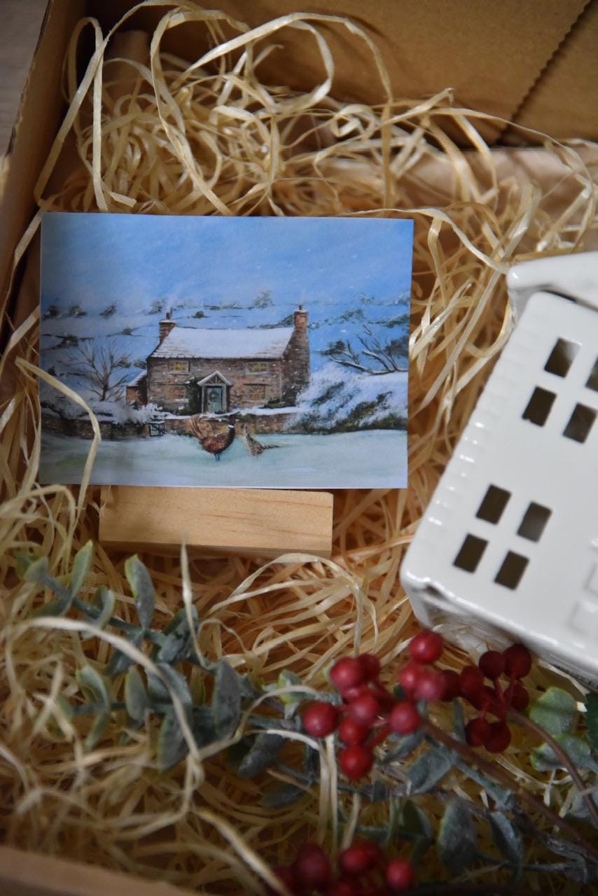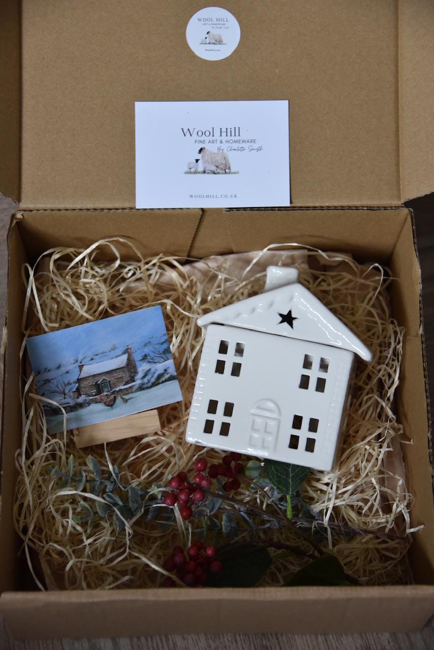 Ceramic House Gift Set with Posy of Eucalyptus and Berries & Handmade Print