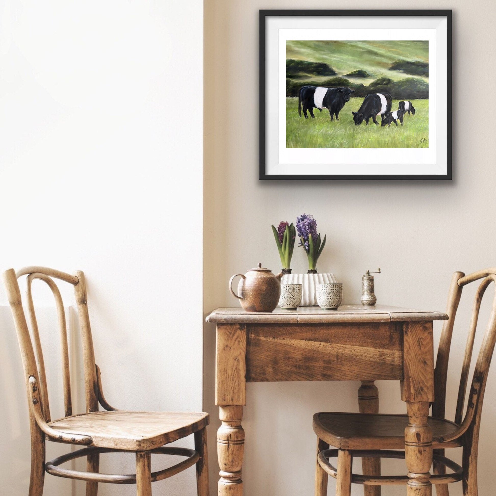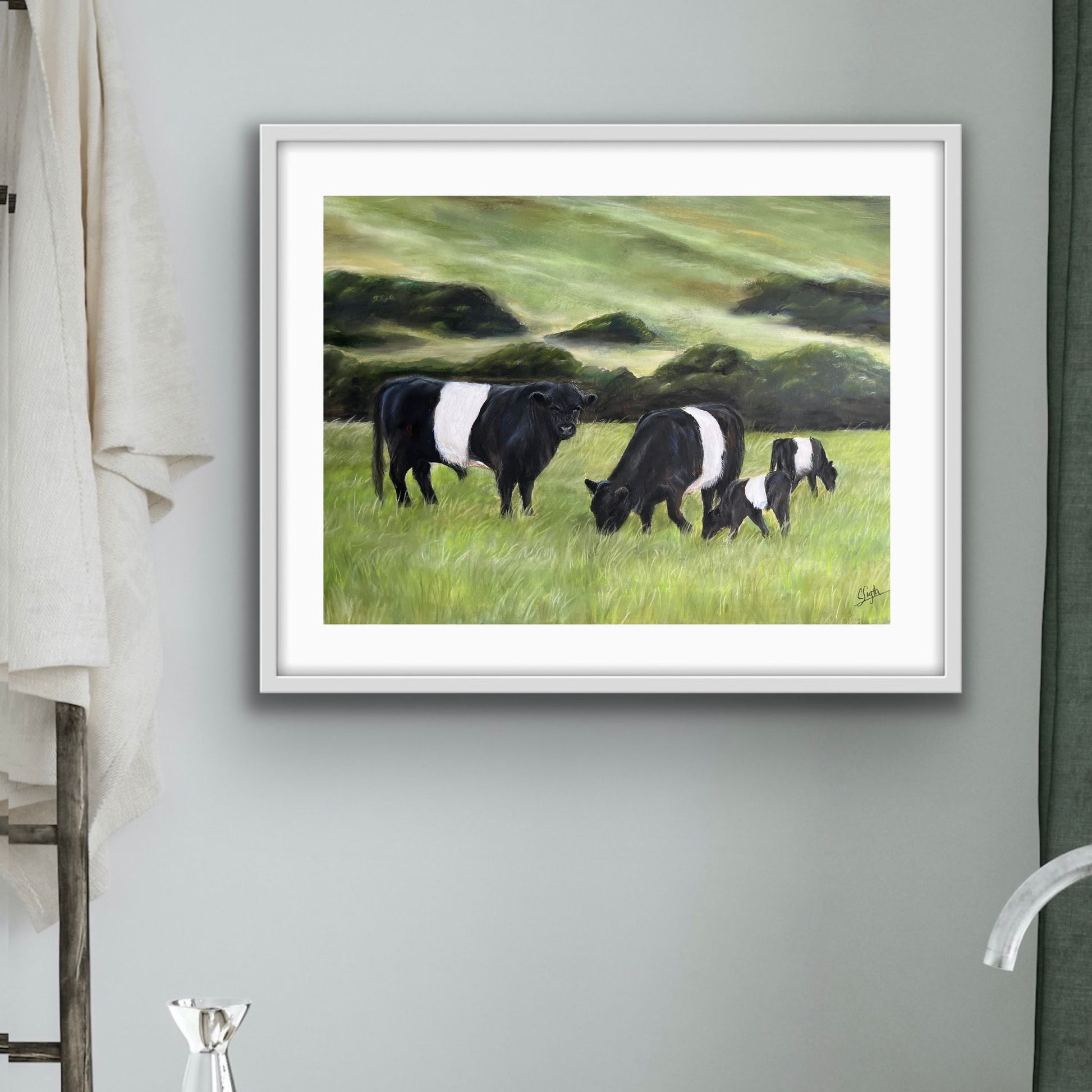 This fine art print is from the original acrylic and pastel painting of a family of Belted Galloways including the cow, twin calves and bull grazing on the hillside. Charlotte pictured the cattle on their own farm based outside Limavady. The Belted Galloway breed are perfect for wintering out on the hillside during the winter months due to their hardy nature.
