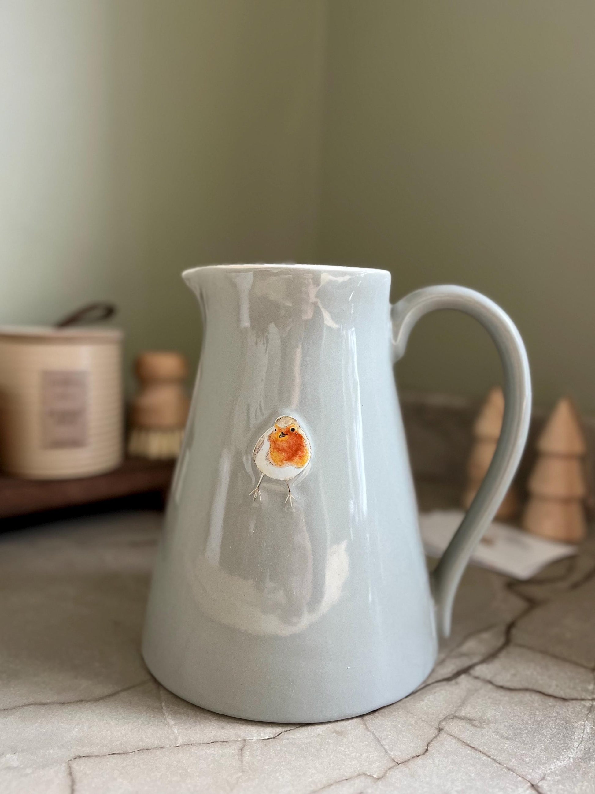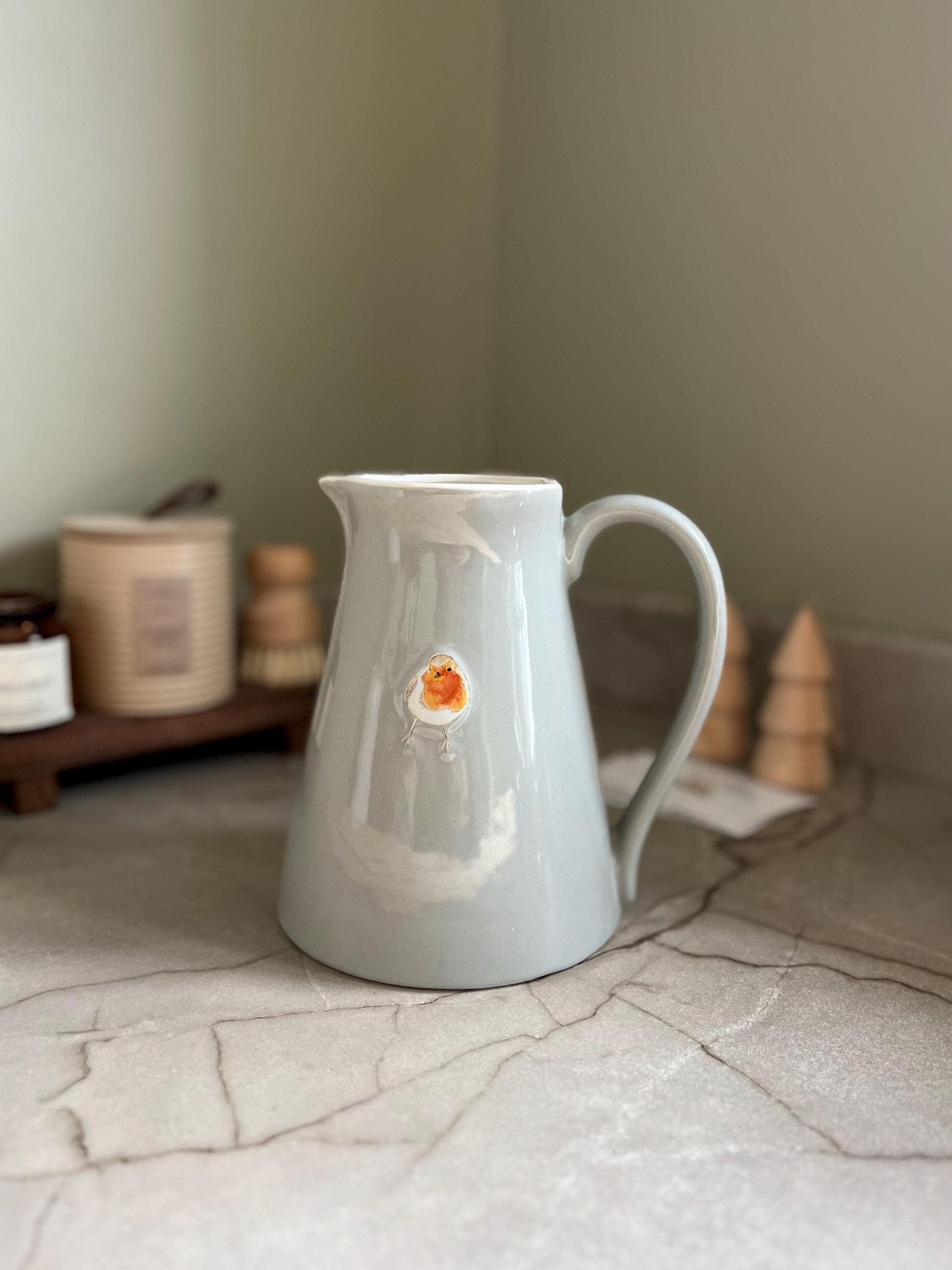 This charming stoneware jug brings a touch of countryside elegance to any room. Featuring a beautifully embossed robin design set against a soft grey backdrop, it's a versatile piece that works wonderfully as a kitchen pitcher or as a decorative vessel for fresh flowers and foliage.