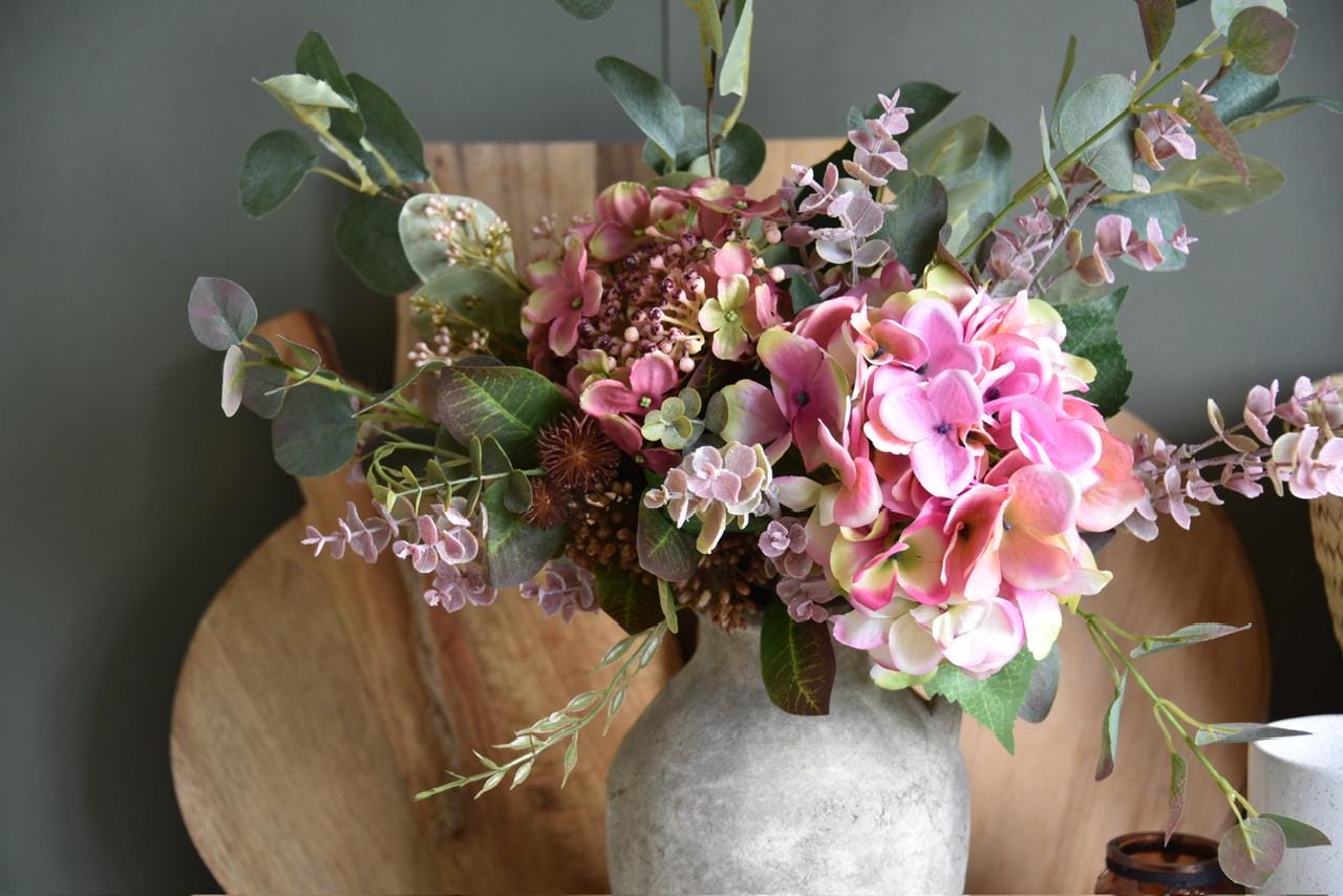 • Includes Pink and cream Hydrangea, vintage pink dried hydrangea, dried style eucalyptus and green eucalyptus.