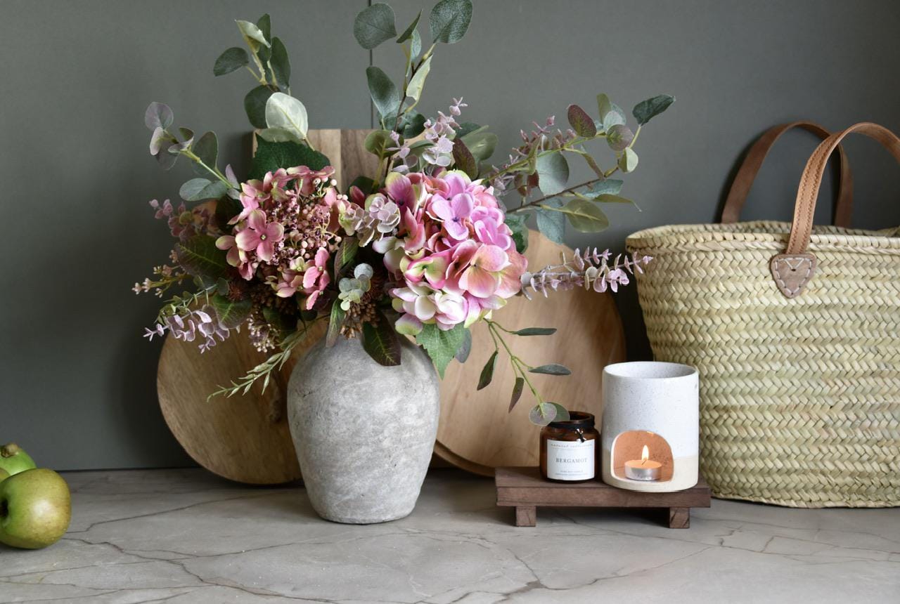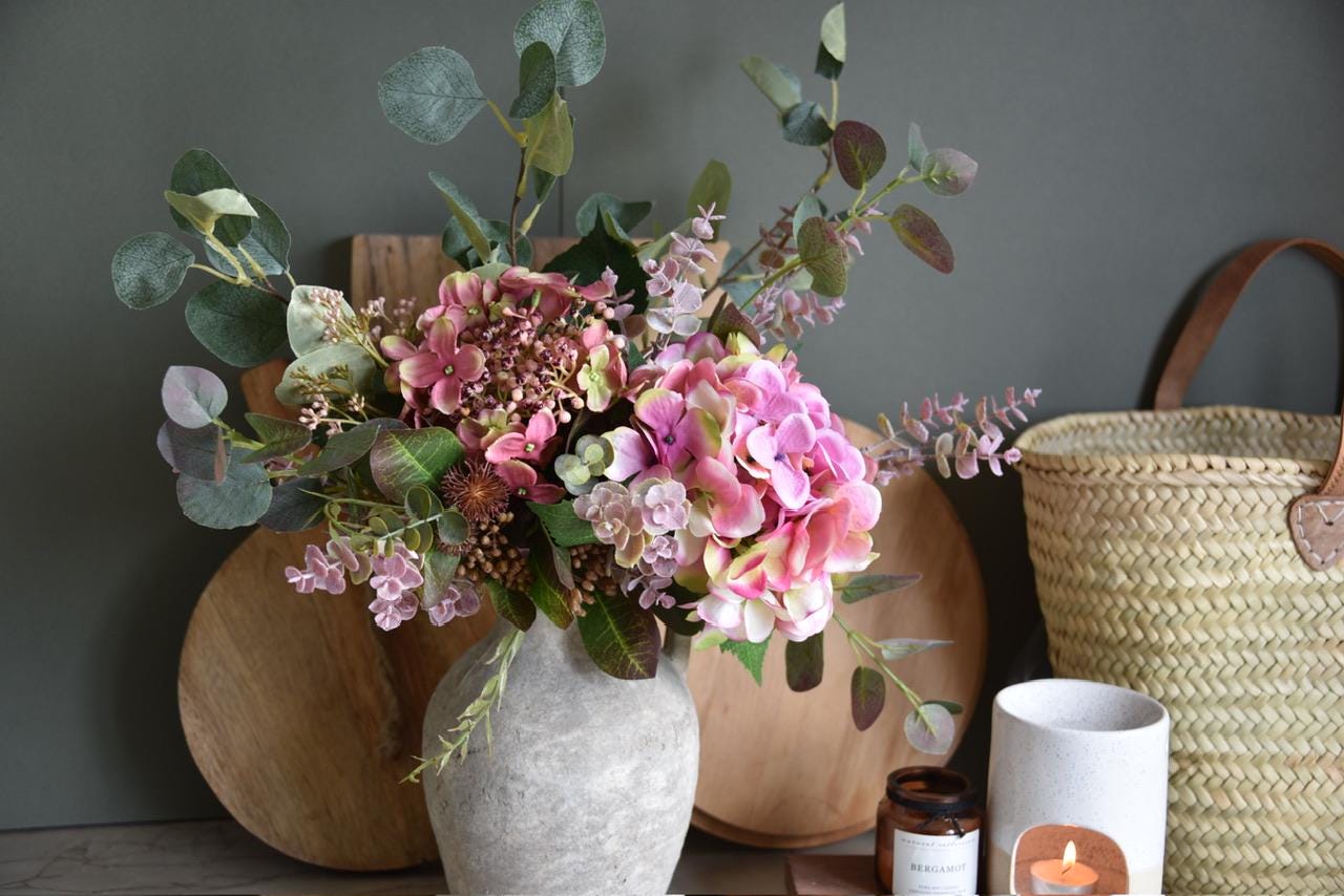 Bring everlasting beauty into your home with this luxurious faux flower arrangement, featuring a soft mix of realistic pink hydrangeas amongst realistic faux eucalyptus foliage.