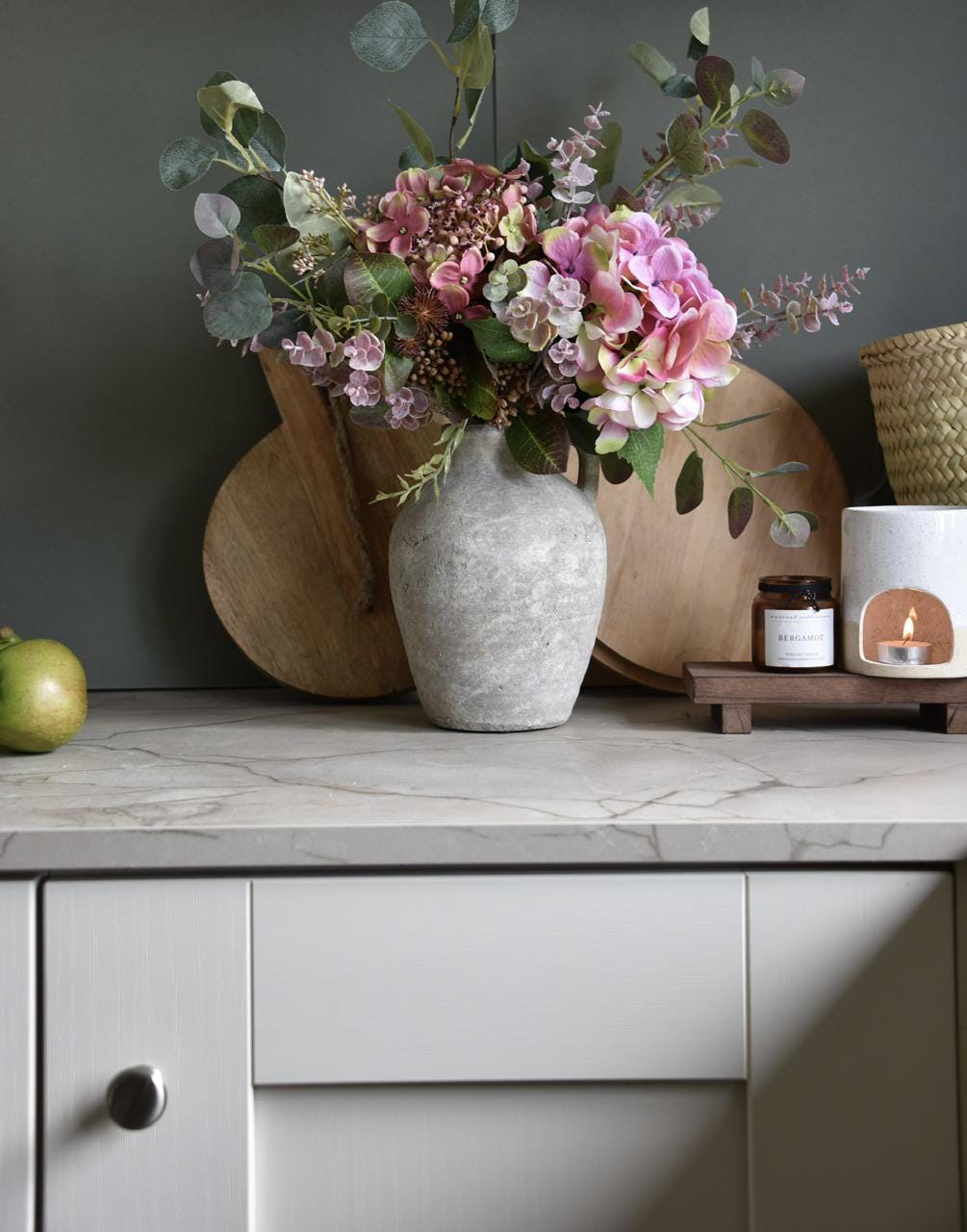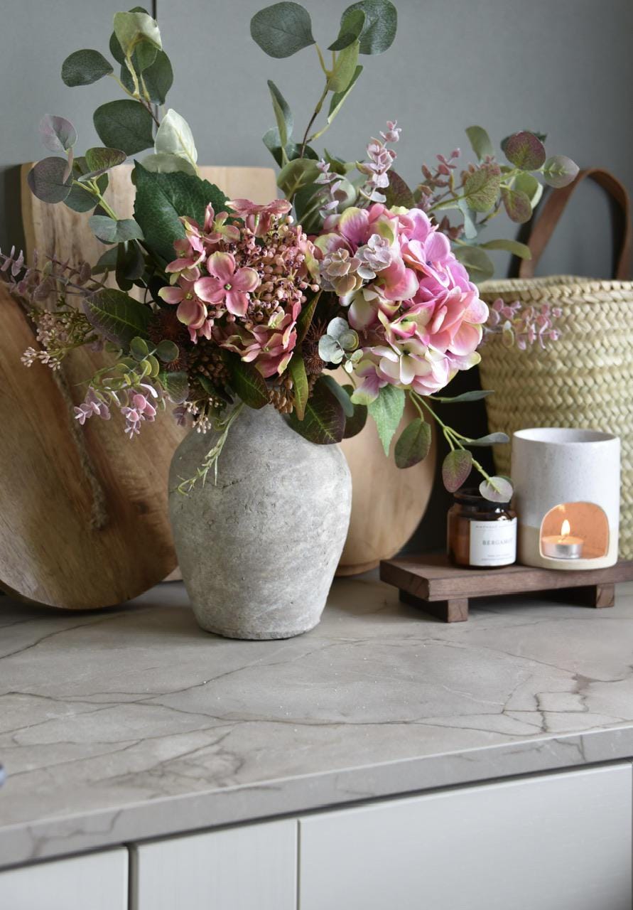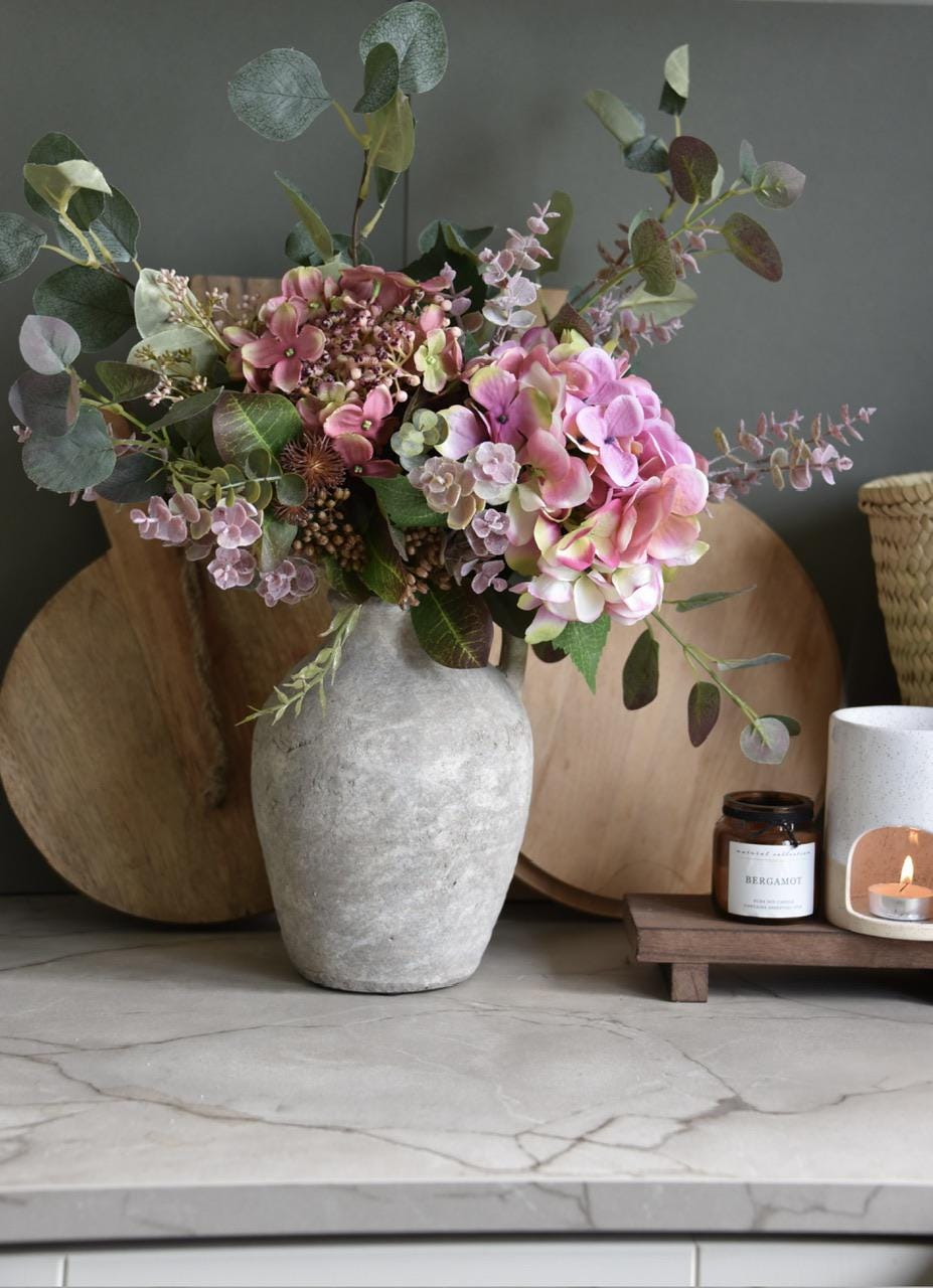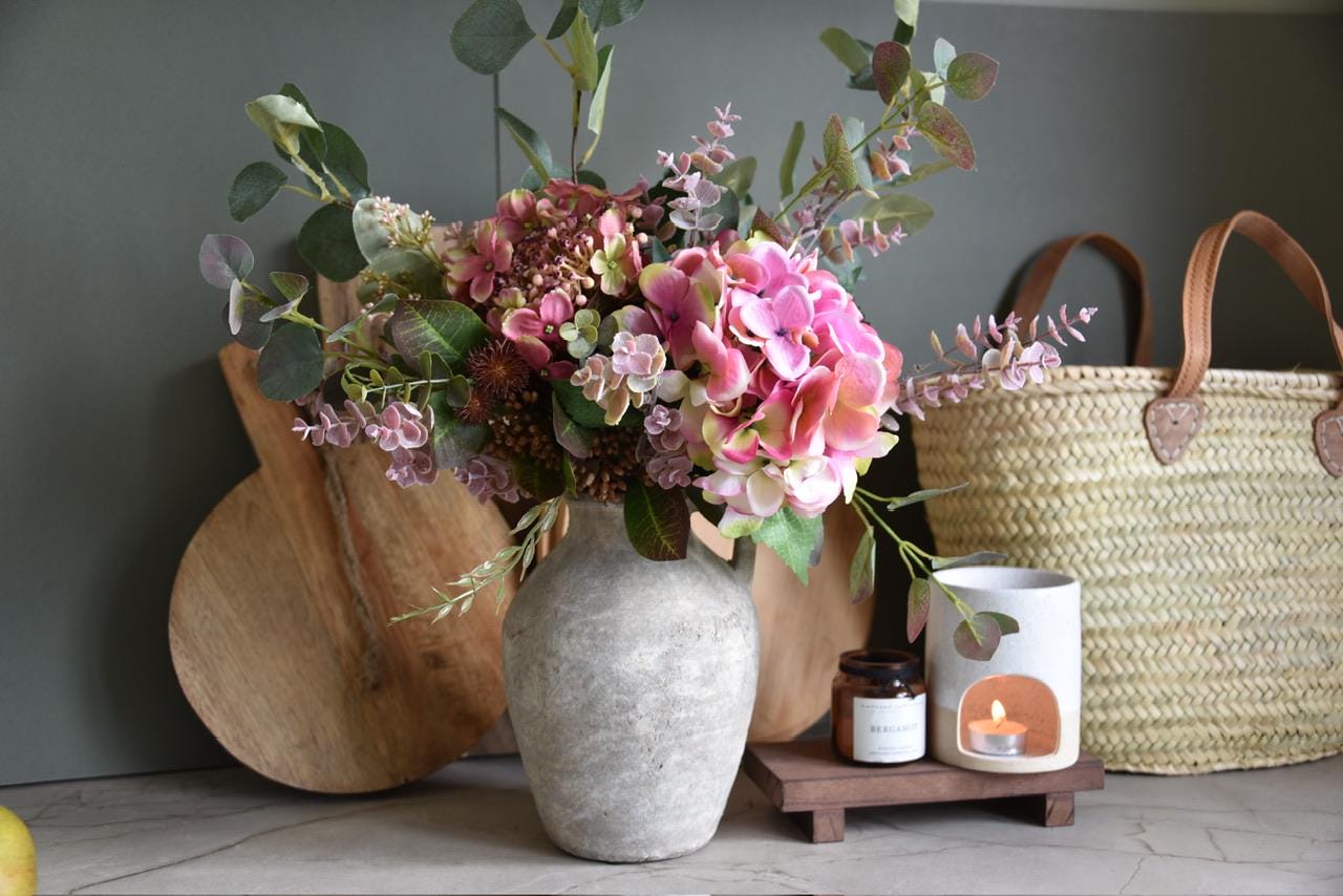 Whimsical Faux Flower Arrangement with Pink and cream Hydrangea, vintage pink dried hydrangea, dried style eucalyptus and green eucalyptus.