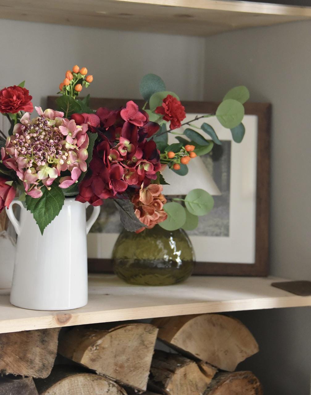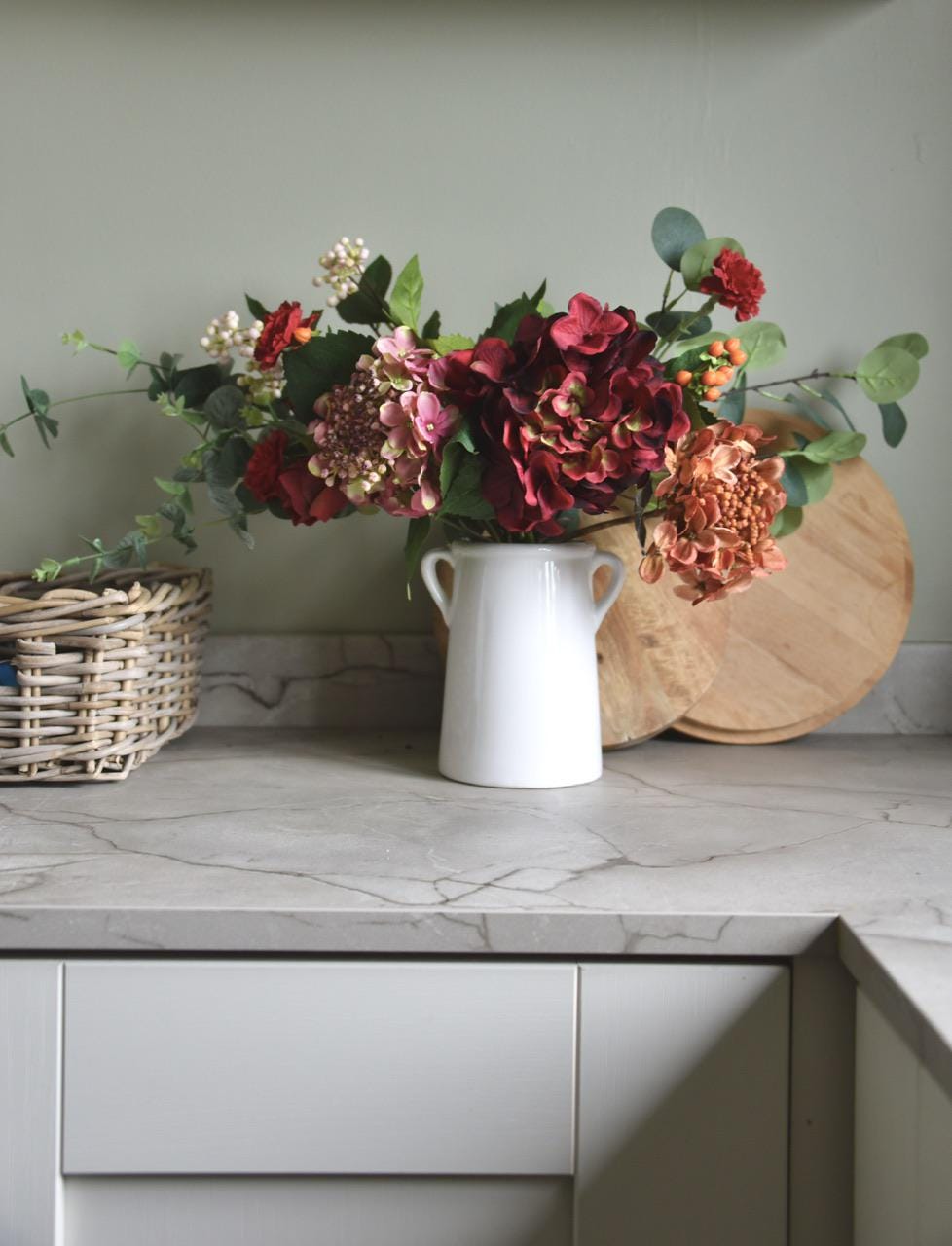 This beautiful floral arrangement is realistic and natural looking with burgundy red, orange pink hydrangeas, seasonal orange, pink and red berries, red carnations and various tones of eucalyptus.