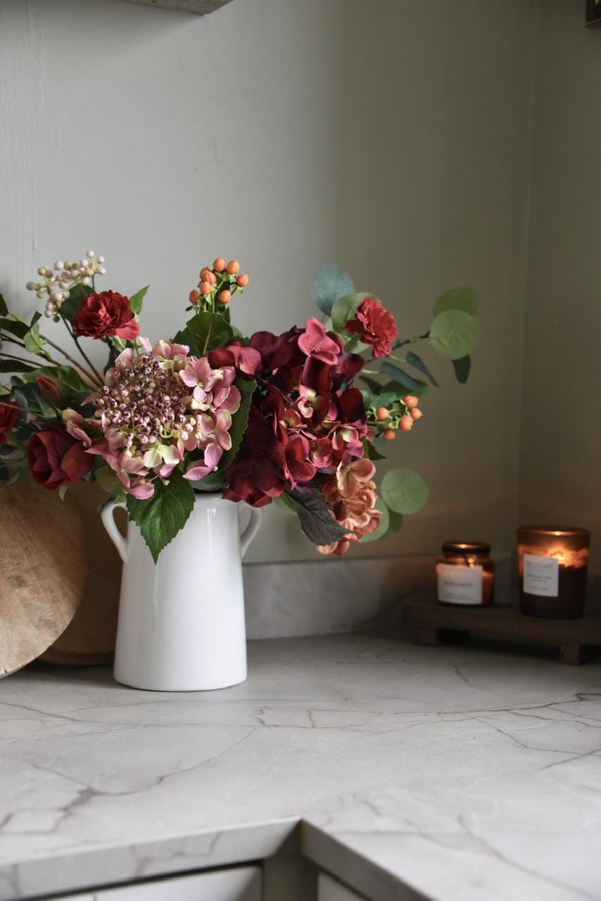 Ideal for home decor including; sideboard, kitchen table, coffee table or as a wedding centrepiece. We also offer bespoke custom faux flower arrangements just message for more information.