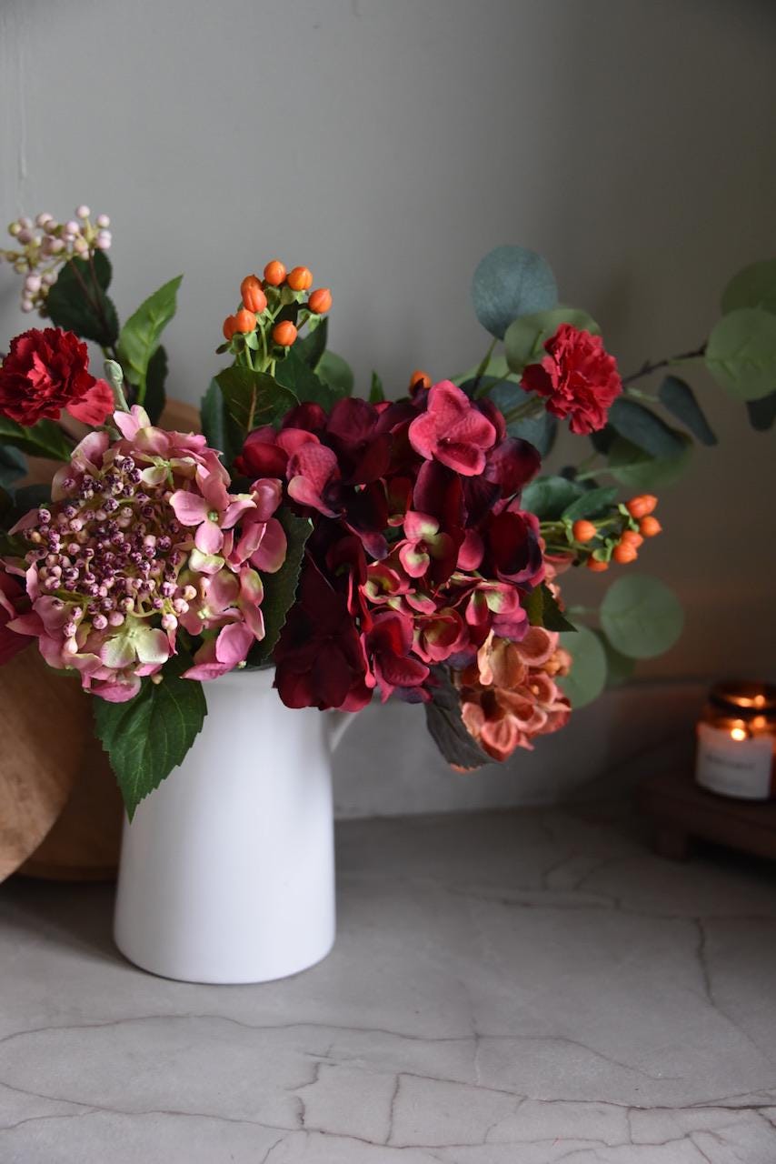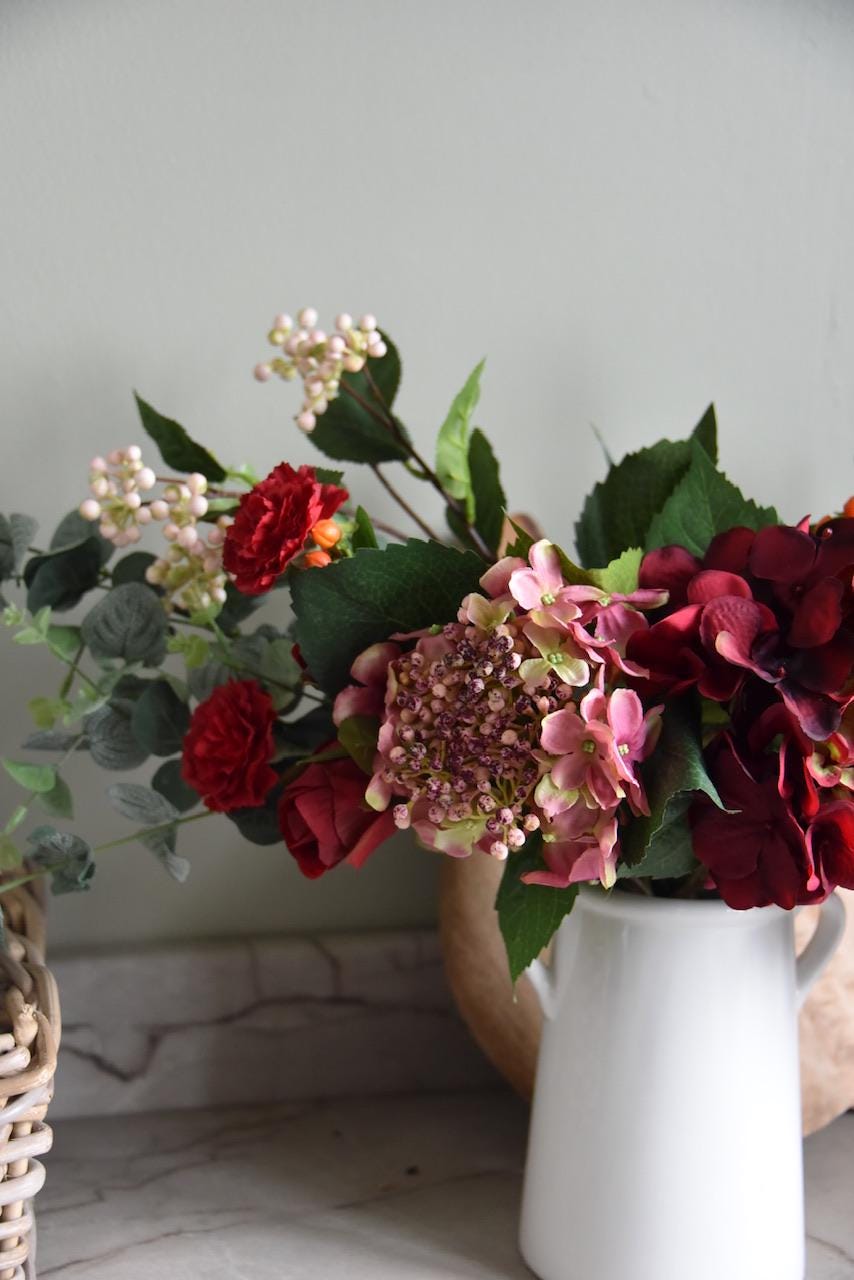 Handmade faux flower arrangement made in Northern Ireland using high quality faux flowers and foliage.