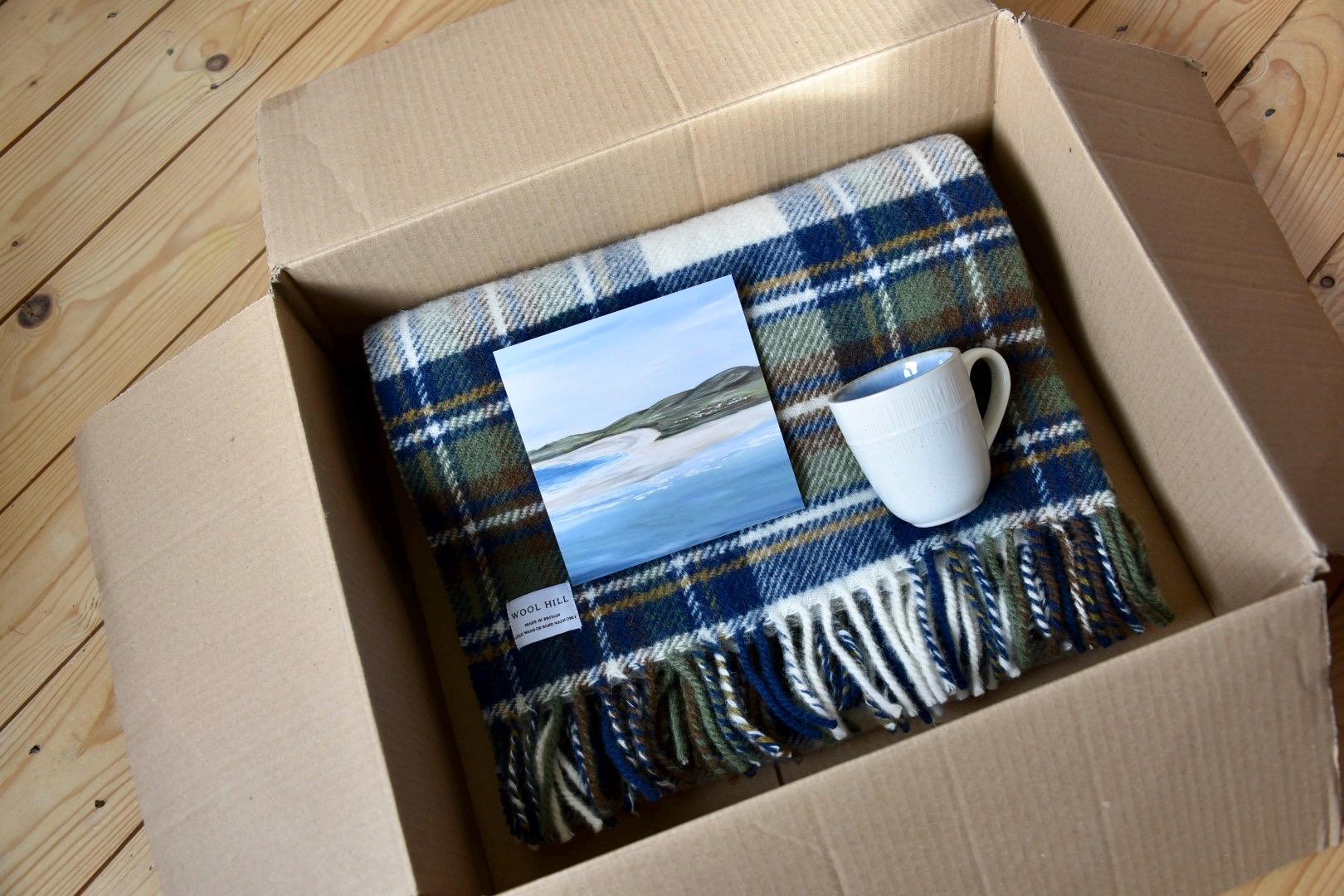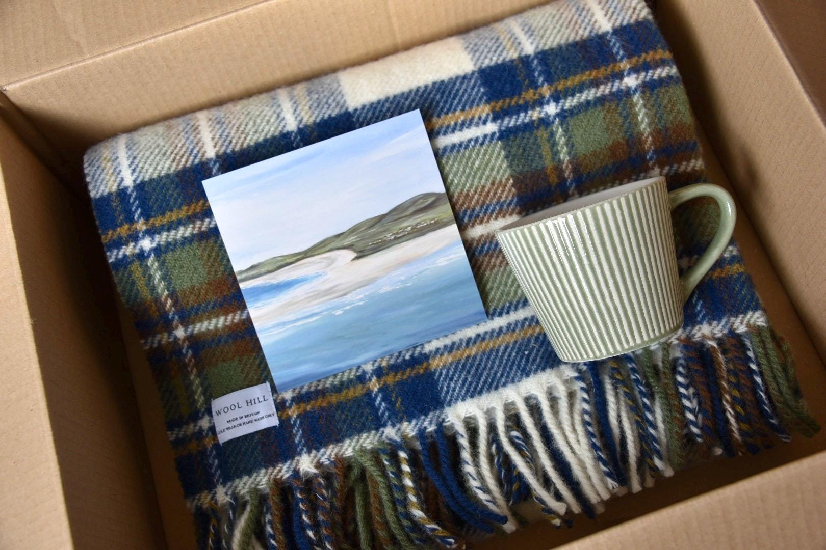 The Caledonian comfort box- Local Print depicting hillside fields rolling down to the beach by Charlotte Smyth, Green ridge mug and wool throw