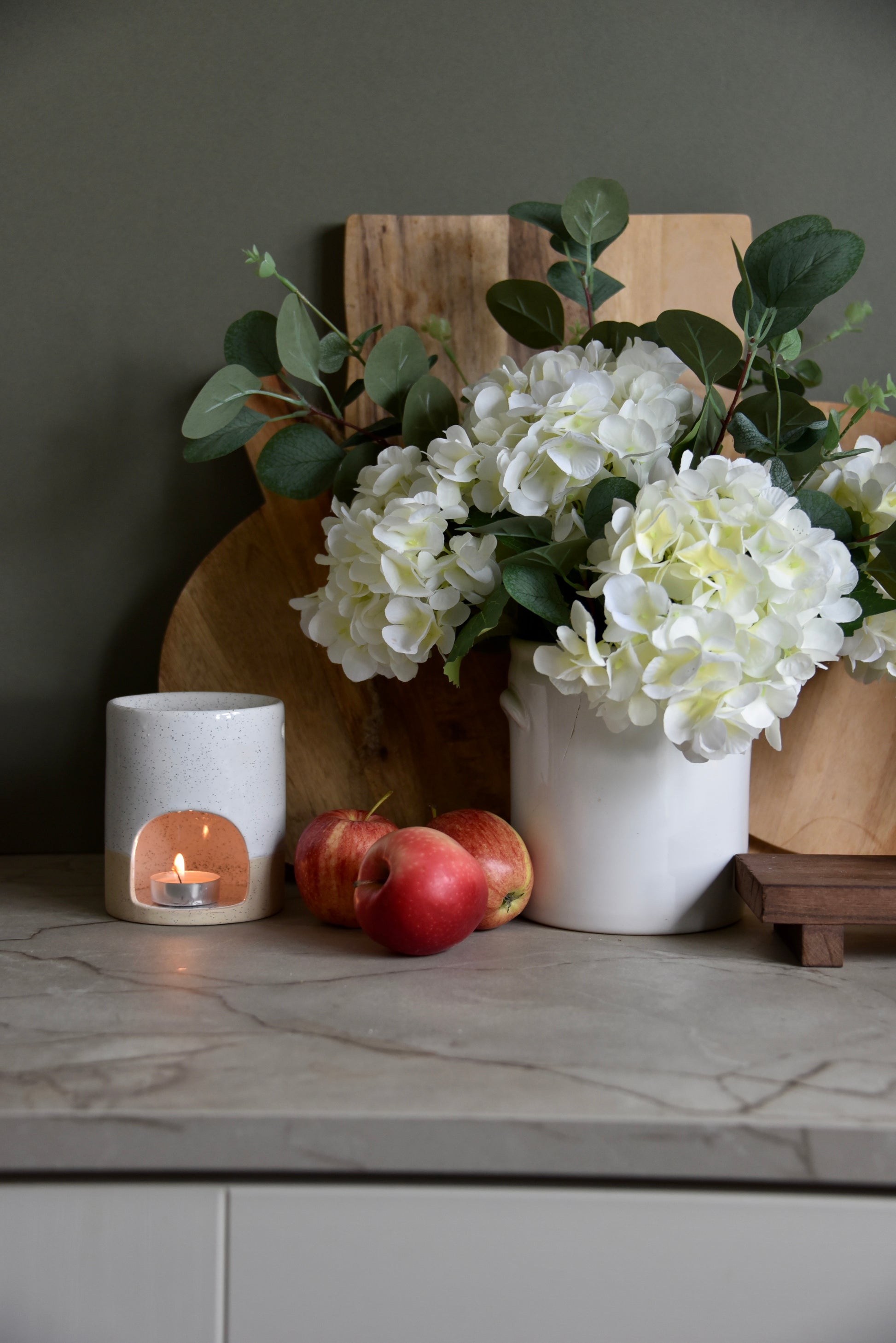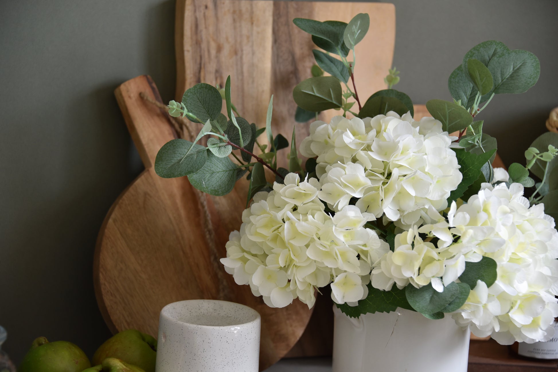 This beautiful floral arrangement is realistic and natural looking with four ivory hydrangeas and eucalyptus spray.
