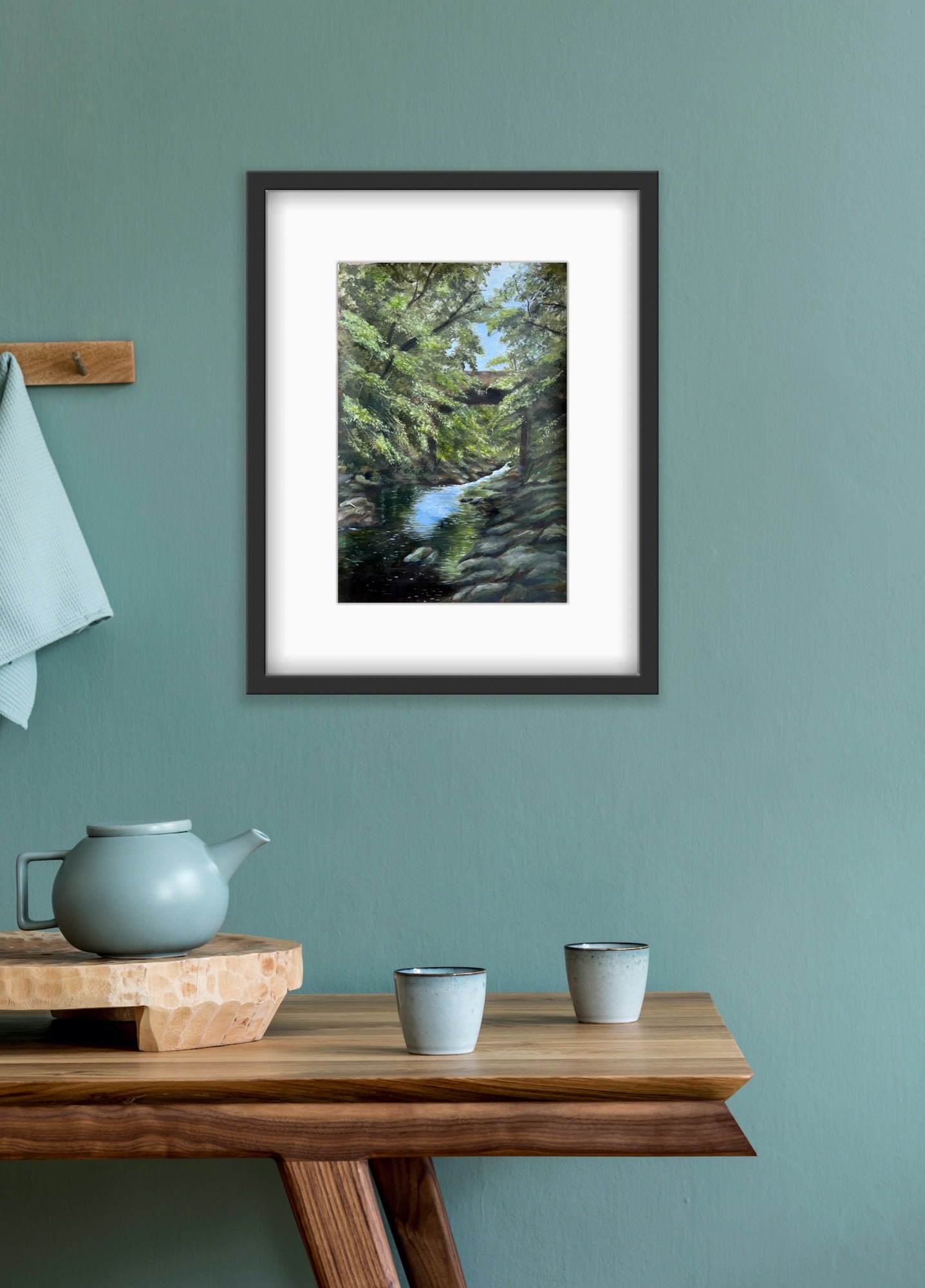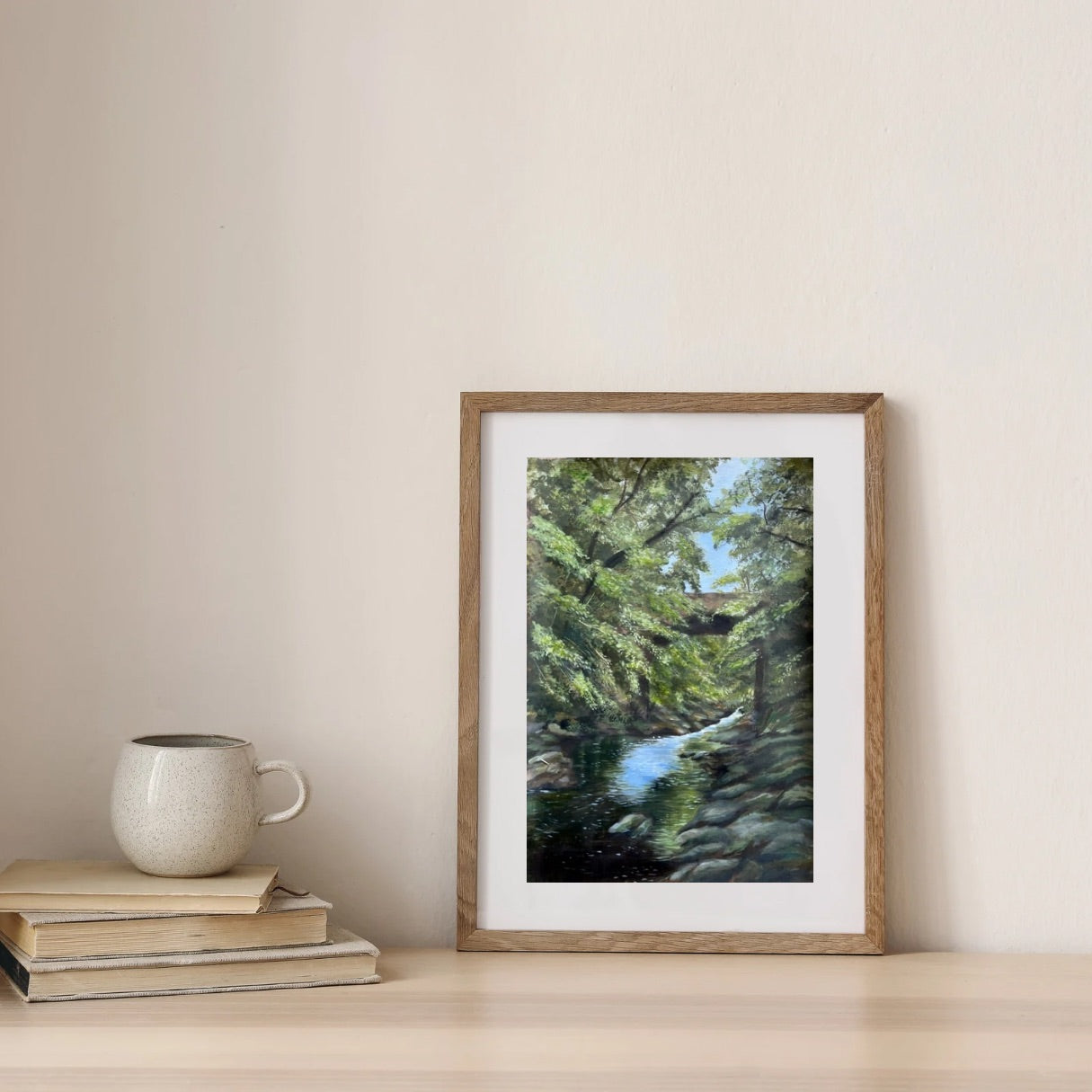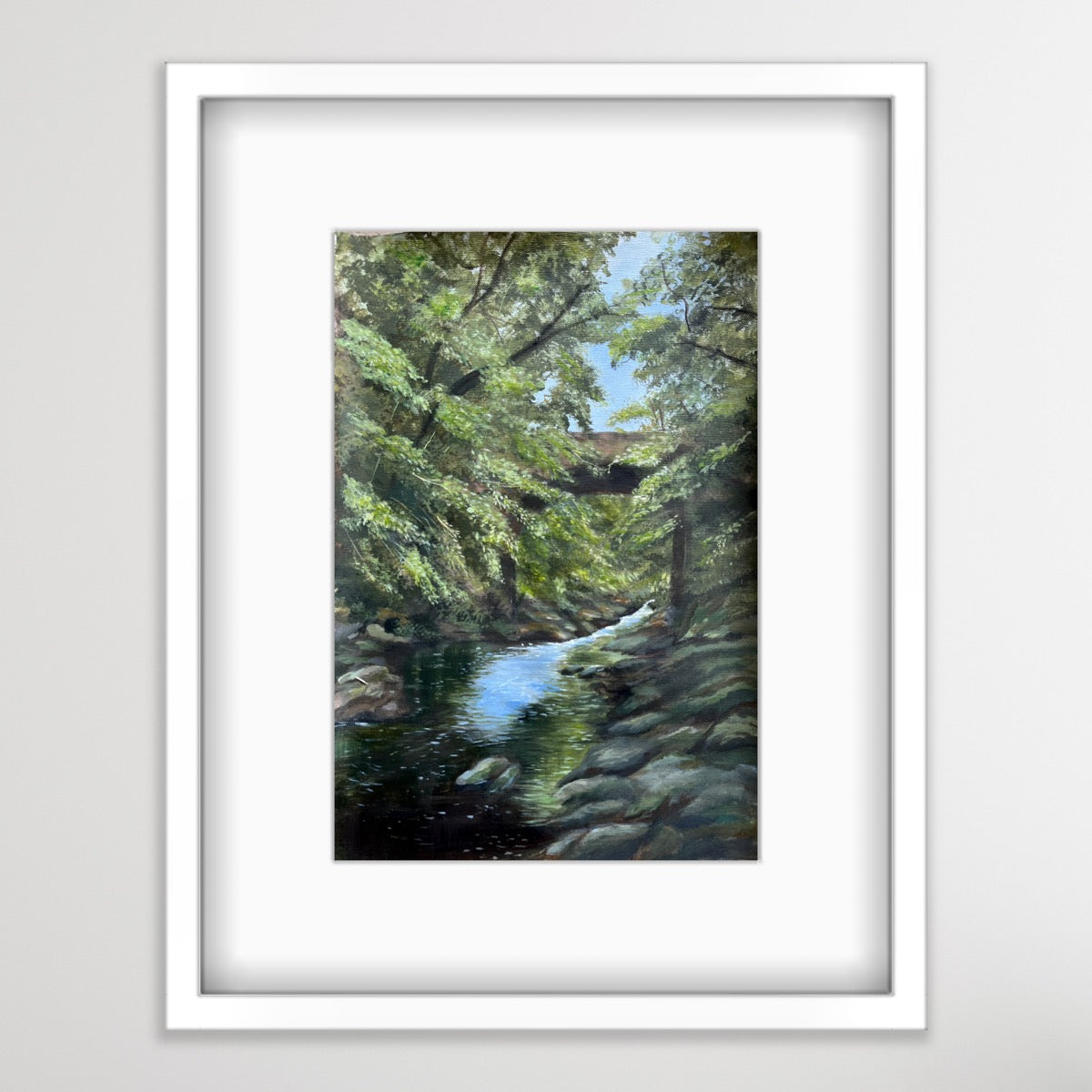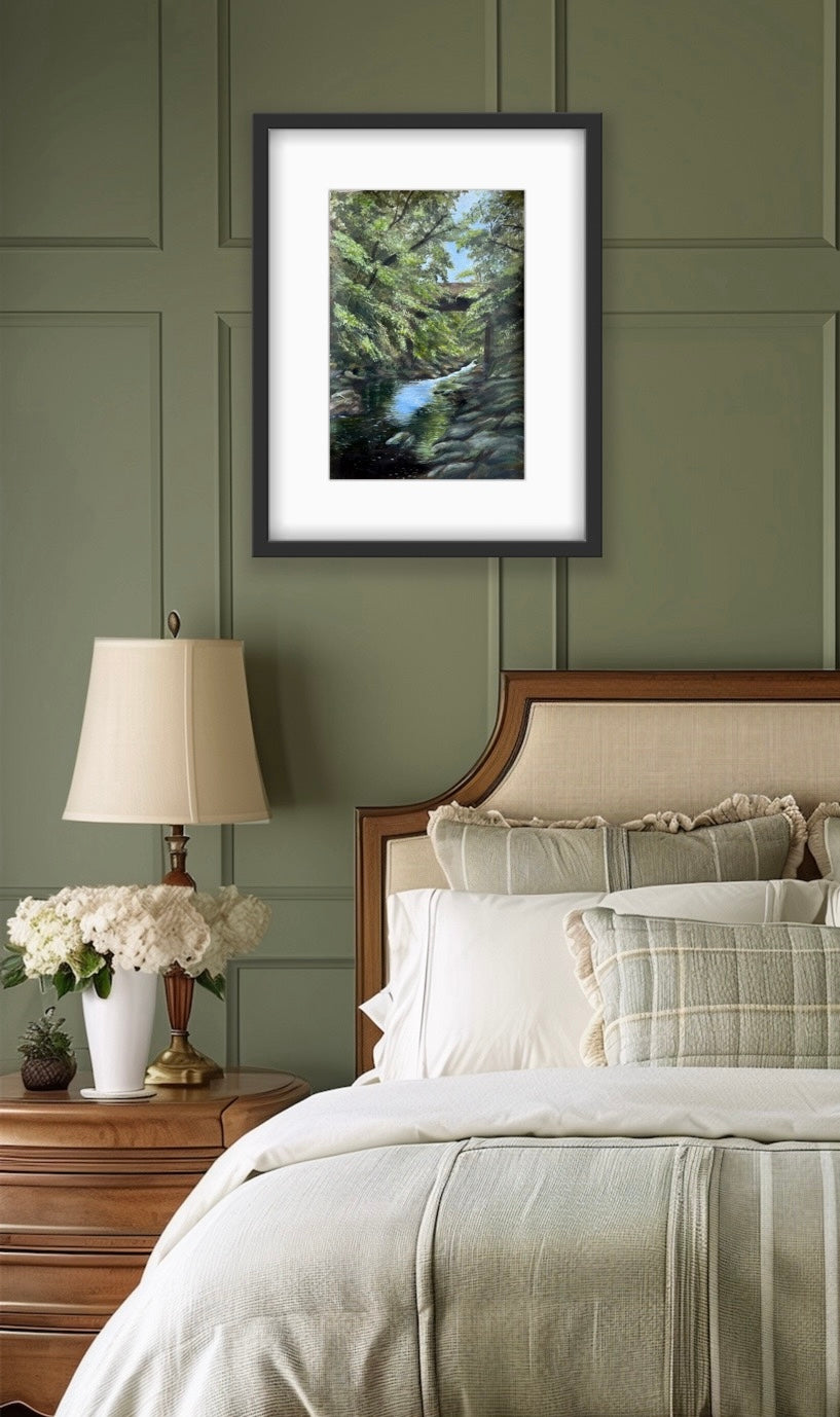 This fine art print is from an original acrylic painting of the Dog Leap Bridge, Roe Valley Country Park, Limavady. The country park is known for its beautiful walk ways along the River Roe and this painting captures the peaceful setting that so many love visiting.