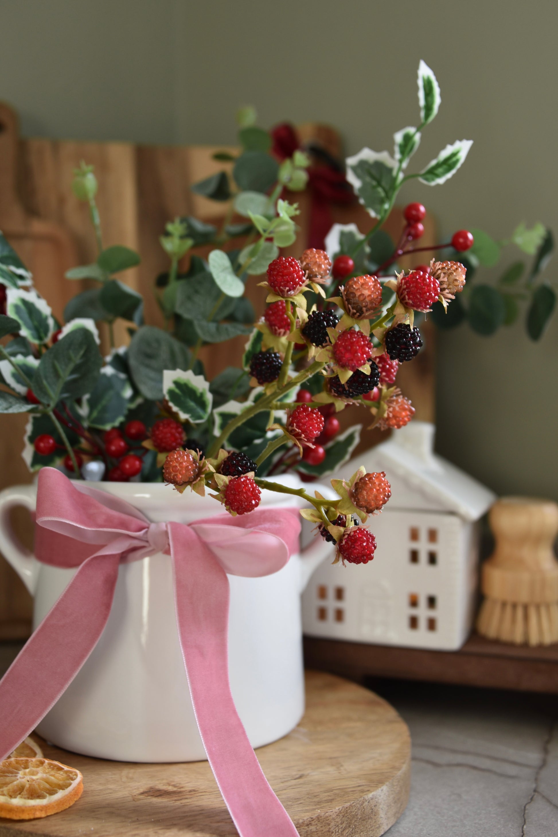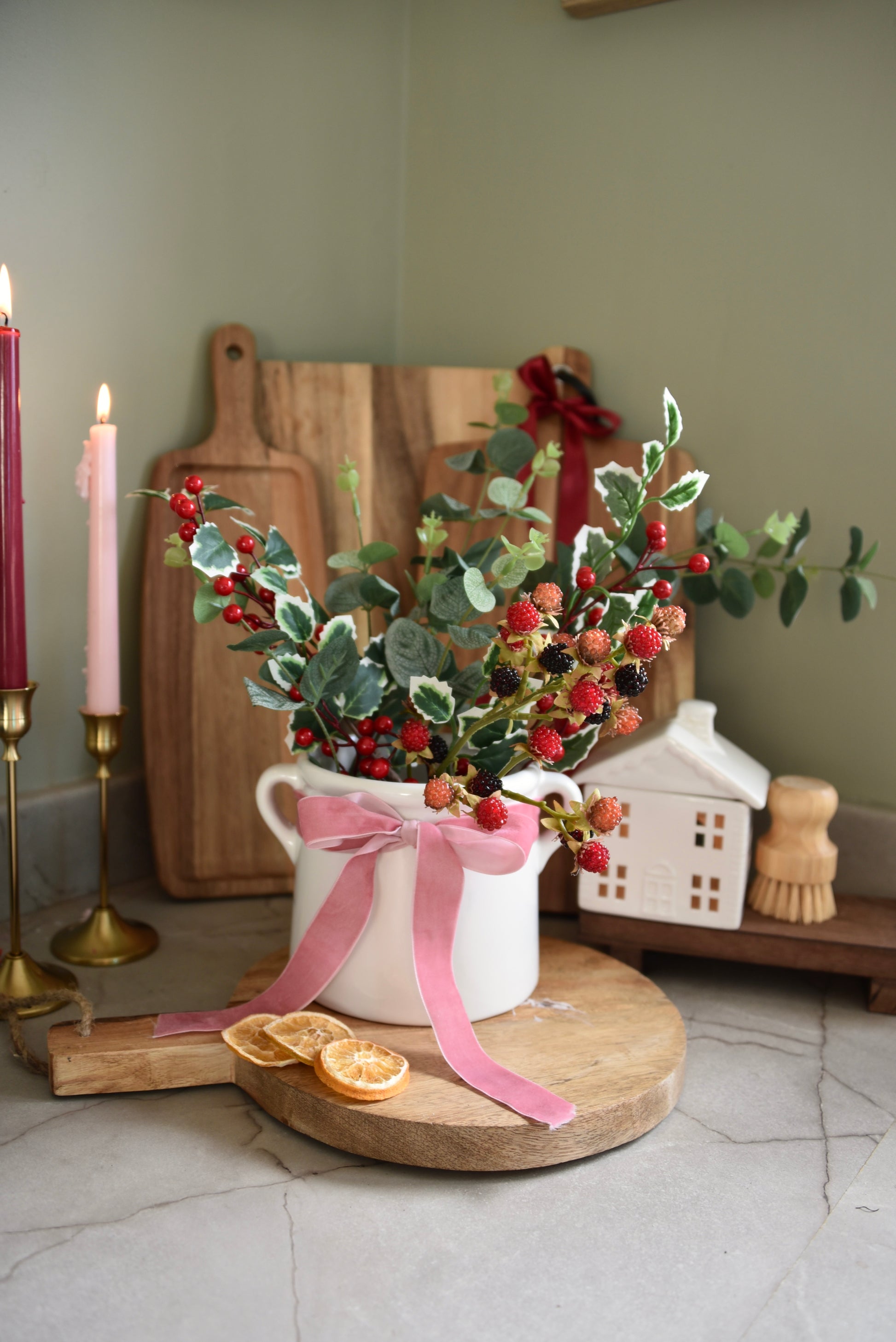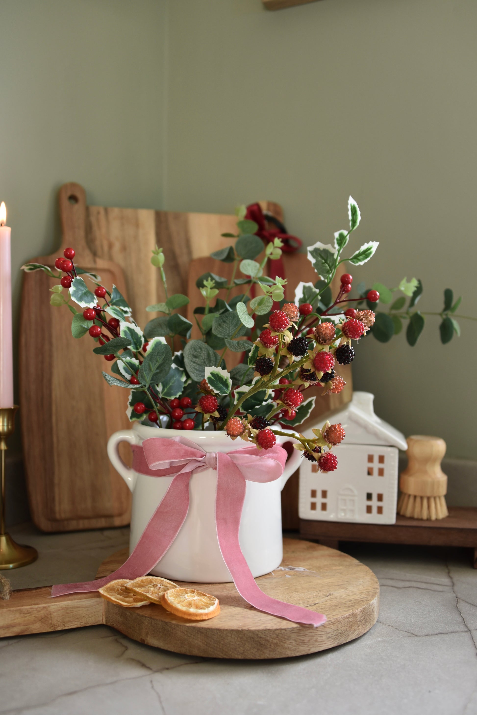 Add a touch of timeless elegance to your home with this beautiful white ceramic vase, styled with a luxurious pink velvet bow and a high-quality faux berry arrangement with eucalyptus and variegated holly sprigs.