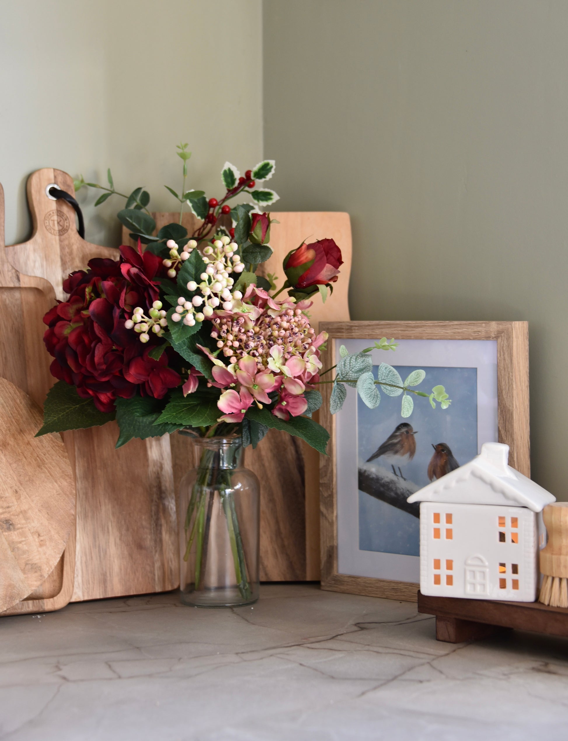 Bring the beauty of the season into your home with this handmade artificial floral arrangement, featuring large deep red and soft pink hydrangeas, delicate pink berries, variegated holly and realistic eucalyptus leaves.