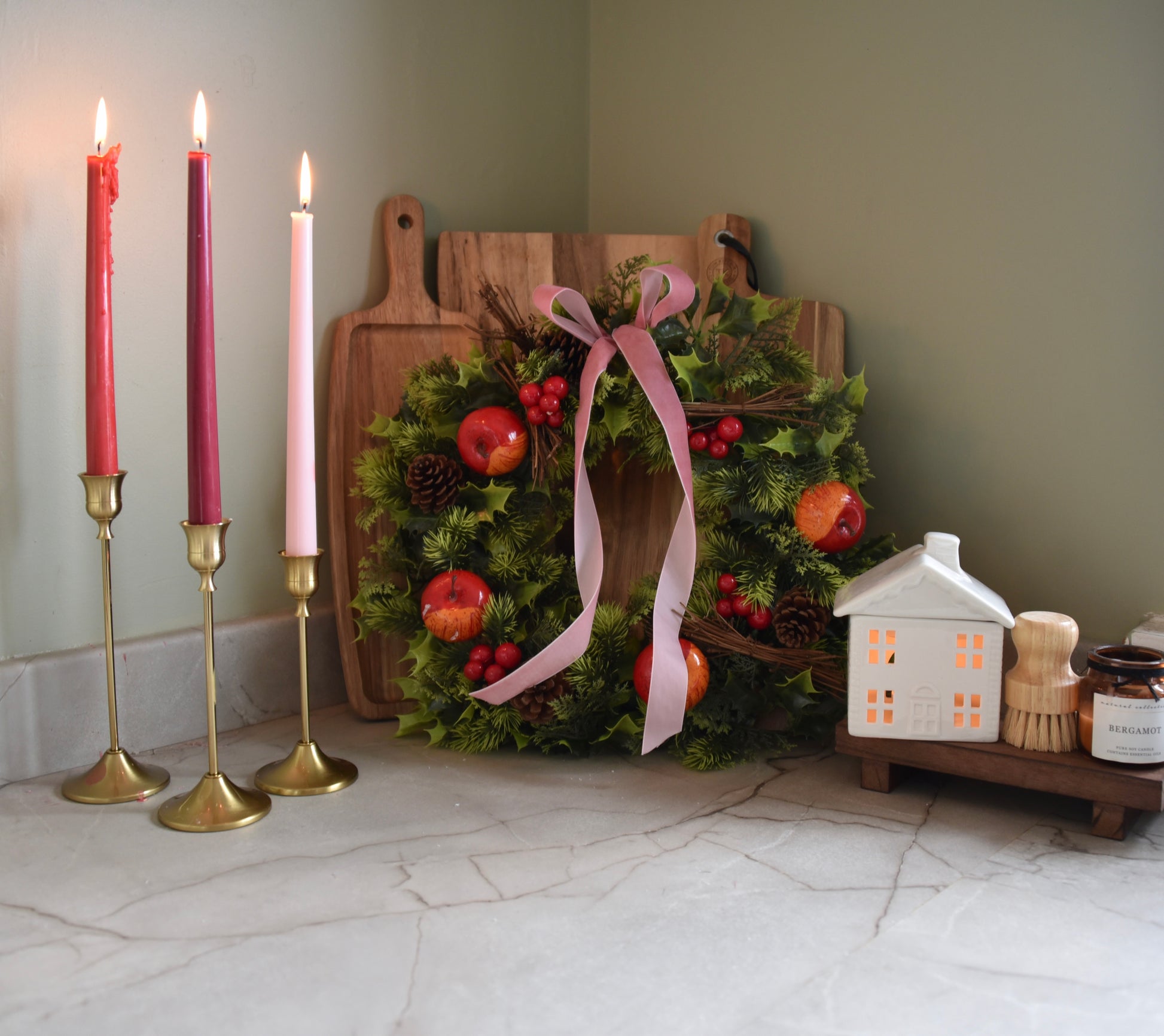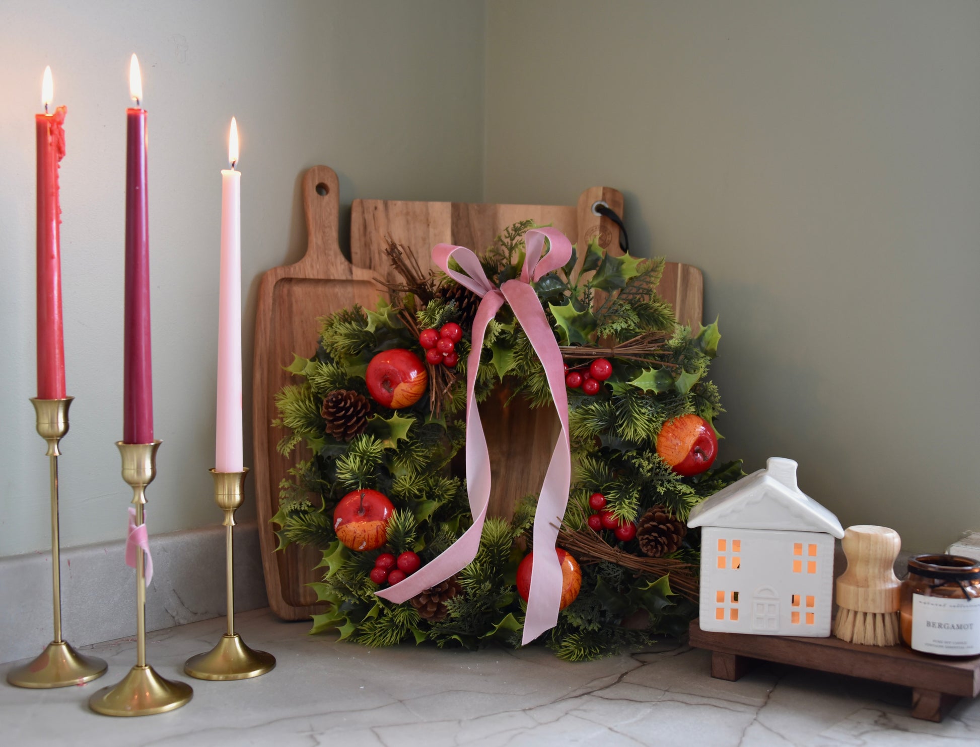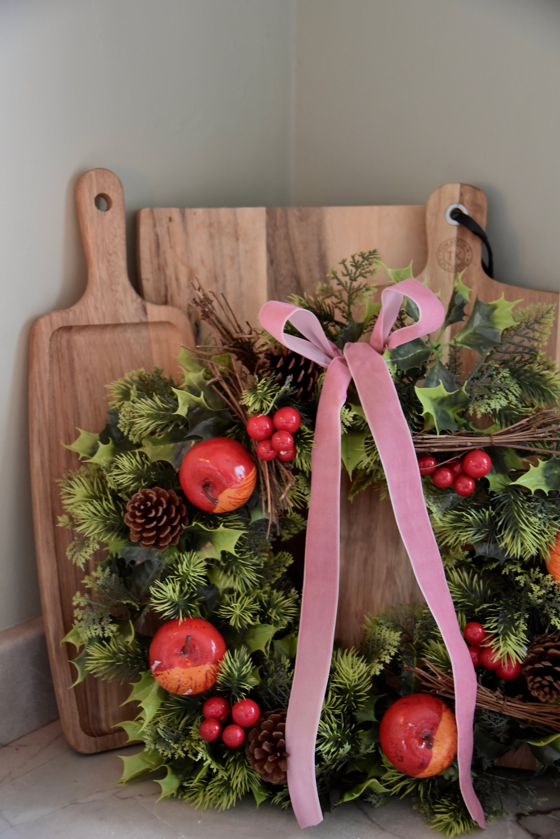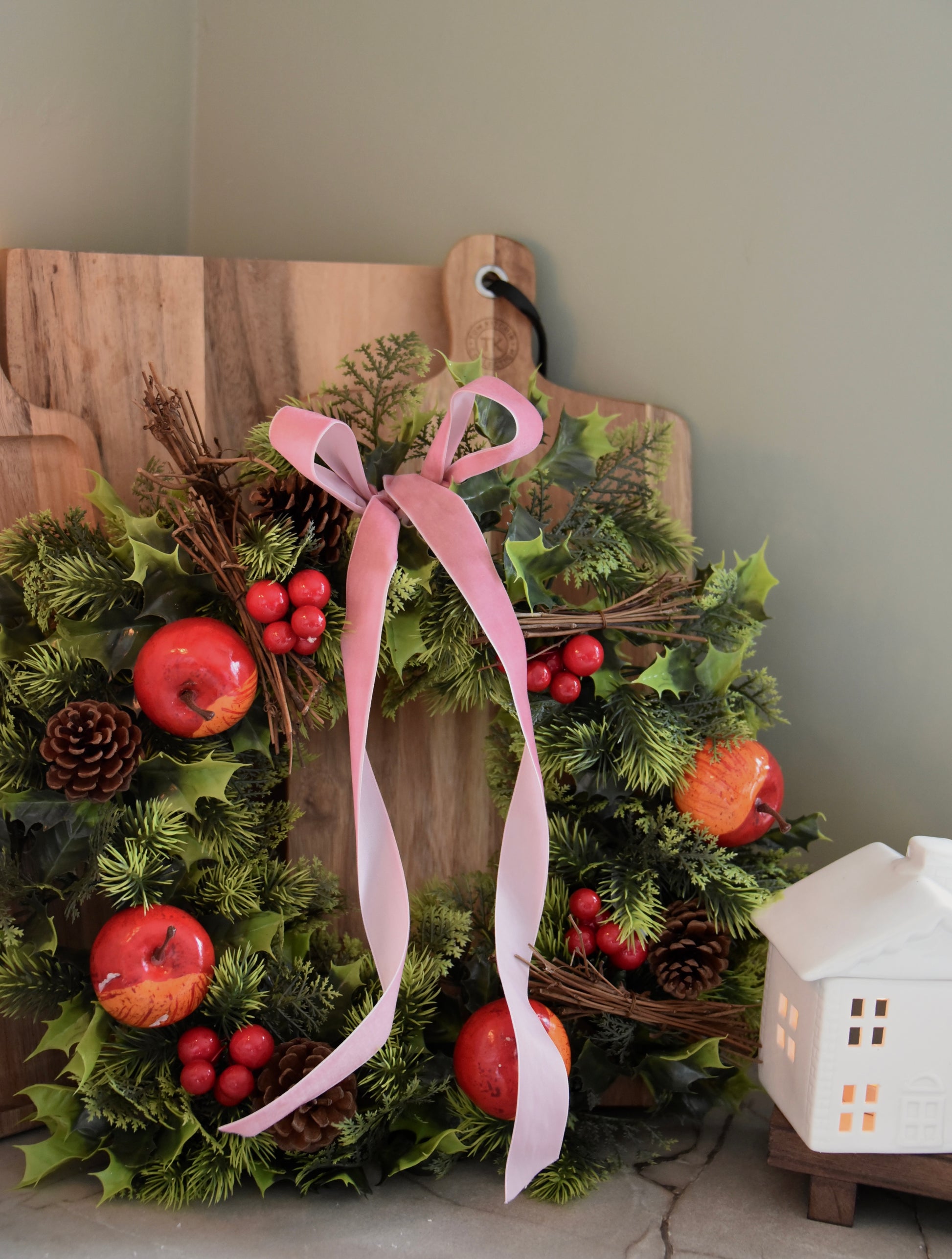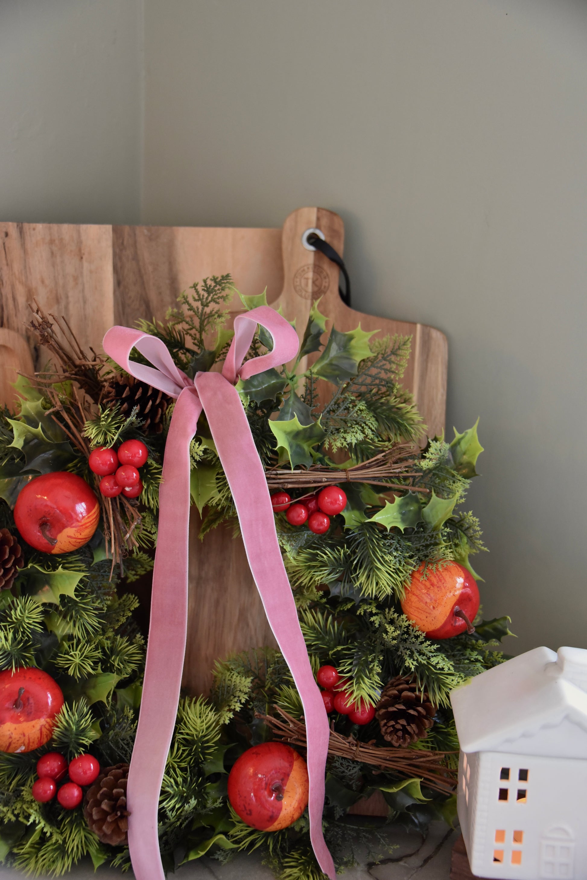 This beautiful Winter wreath includes realistic berries, Autumnal fruit, pine cones and cinnamon sticks, set amongst green eucalyptus and green spruce foliage. The wreath is finished with a hand tied dusky pink velvet bow.